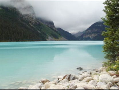 Hồ Lake Louis trong vắt màu ngọc bích, xa xa là những ngọn núi ẩn mình trong mây…