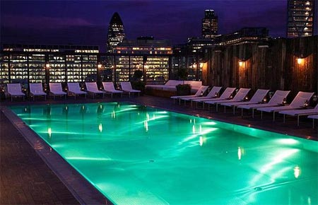 | The Roof Top Shoreditch House tại London, Anh, hấp dẫn bởi âm nhạc du dương và những chiếc ghế nghỉ bao quanh hồ bơi trên nóc nhà. |
