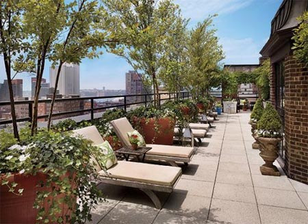 | Tại nhà hàng Sky Terrace ở New York, bạn có thể gọi một cốc nước chanh và ngồi nghỉ trên những chiếc ghế dài dưới tán cây xanh mát để ngắm nghìn con sông Hudson |