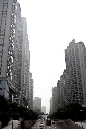 | Đường phố ở Quảng Châu với 5 làn xe mỗi chiều, cùng những tòa chung cư cao vút được xây hai bên. |