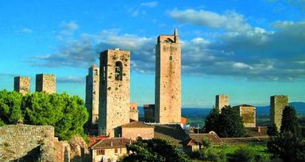 Từ xa đã thấy thành phố San Gimignano với những ngọn tháp cổ uy nghi ngự trị trên ngọn đồi bề thế nhất. Từ thế kỷ thứ XI đến XIII, các lãnh chúa ở đây đã xây 72 ngọn tháp, trong đó có những ngọn cao hơn 50m nhằm phô trương sức mạnh và uy quyền. Ngày nay chỉ còn 14 ngọn tháp nguyên vẹn nhưng cũng đủ để thành phố này được du khách trìu mến gọi là “thành phố những ngọn tháp đẹp”. Nằm cách xa những trục đường chính, một thời San Gimignano bị lãng quên, nhưng nhờ đó đây là nơi mà kiến trúc và không khí thành thị Ý thời trung cổ được giữ gìn tốt nhất.