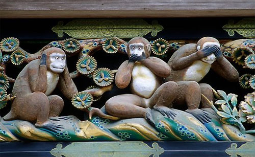 | Bức khắc nổi hình ba chú khỉ che tai, che mắt, che miệng với ngụ ý: không nghe điều xấu, không nhìn điều xấu, không nói điều xấu. |
