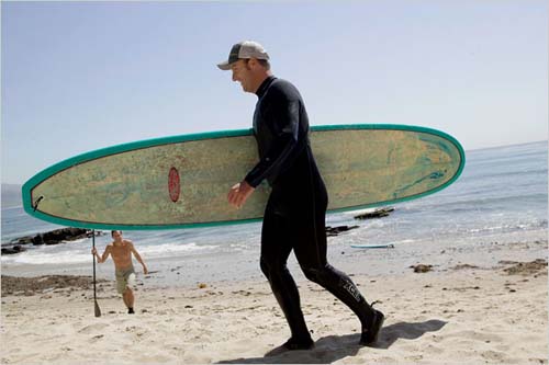 | Lướt sóng là môn thể thao phổ biến ở đây. Kai Sanson (áo đen) là hướng dẫn viên tại một trung tâm dạy lướt sóng. Anh thường xuyên luyện tập trên bãi biển Malibu. |