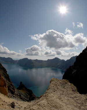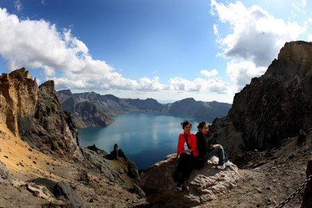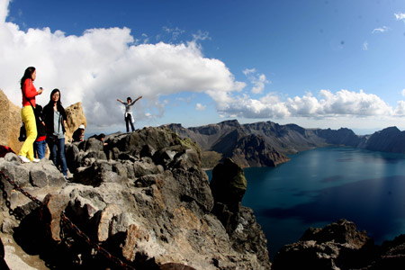 | Du khách chụp ảnh với background là hồ nước hình thành từ miệng núi lửa cũ trên đỉnh Trường Bạch tại châu tự trị dân tộc Triều Tiên Diên Biên, tỉnh Cát Lâm. Không chỉ có phong cảnh tuyệt đẹp, núi Trường Bạch còn là nơi sở hữu nguồn tài nguyên sinh vật quý hiếm. |