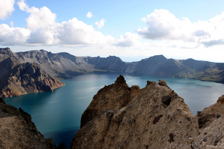 Khung cảnh đẹp như tranh của hồ nước hình thành trên miệng núi lửa cũ Trường Bạch, tỉnh Cát Lâm (Trung Quốc) khiến du khách không khỏi ngẩn ngơ.