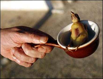 Cách ăn món chim này cũng cực kì độc đáo, người ta đặt con vật vào miệng sao cho đầu con vật hướng ra bên ngoài và nhai nó một cách từ từ để cảm nhận được hương vị của món ăn.