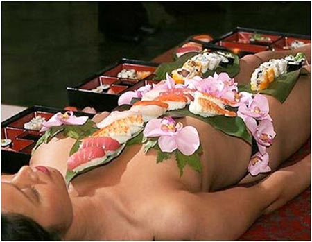 Một hình thức giải trí đặc biệt, điển hình khác là body sushi: đồ ăn được xếp lên cơ thể khỏa thân của một cô gái. Loại hình này đã có lịch sử hơn 1.000 năm ở Nhật Bản. Để có thể làm được nghề này, các cô gái phải được huấn luyện rất nghiêm ngặt. Trong các buổi huấn luyện, họ bắt buộc phải khỏa thân, nằm ngửa trên bàn, người ta xếp sáu quả trứng lên một số vị trí trên cơ thể và họ phải nằm im suốt bốn giờ sao cho tất cả trứng luôn ở nguyên vị trí. Mắt phải nhìn thẳng, không được liếc đi bất cứ đâu. Trong bốn tiếng đồng hồ đó, sẽ có người ngồi bên cạnh liên tục rót rượu lên cơ thể họ, nếu cơ thể động đậy thì sẽ phải huấn luyện lại từ đầu.