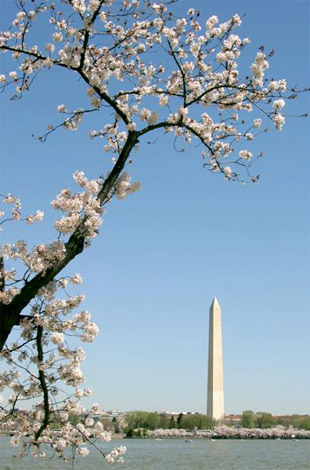 | Tháp bút chì, biểu tượng của Washington D.C., trong mùa hoa anh đào nở rực rỡ dọc bờ hồ Potomac. Thường hoa anh đào nở tầm cuối tháng 3 hoặc đầu tháng 4 (tùy theo thời tiết khí hậu trong vùng). |