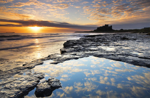 Bình minh trên bờ biển gần Lâu đài Bamburgh Castle, nước Anh