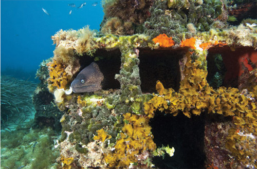 Lươn Moray thò đầu ra từ một cái lỗ của rạn san hô nhân tạo