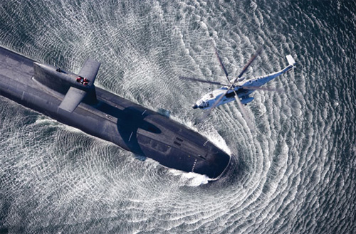 Máy bay trực thăng quân đội bay phía trên tàu ngầm ở biển Iroise Sea, nước Pháp