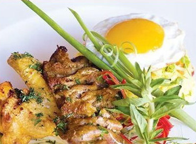 Trứng gà đem ốp-la. Cánh gà nướng trên lửa nhỏ cho chín đều. Bắc chảo nóng, cho cơm vào rang chung với đậu bo, cà rốt và tôm. Nén cơm rang vào bát rồi trút ra đĩa. Đặt trứng ốp la lên trên. Xếp gà và thịt kế bên.