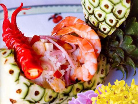 Dứa gọt phần gai, giữ vỏ xanh. Cắt một mặt quả dứa, khoét và moi ruột thành hình chiếc xuồng. Lấy một phần ruột dứa thái hạt lựu được khoảng 2 thìa súp là được.