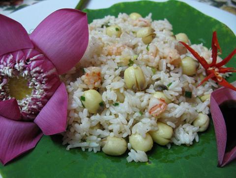 Bắc chảo nóng, phi thơm hành tây rồi cho cơm vào chiên với tôm khô, mực và hạt sen. Nêm nếm vừa ăn. Trút cơm vào lá sen gói hấp lần nữa, dùng nóng.