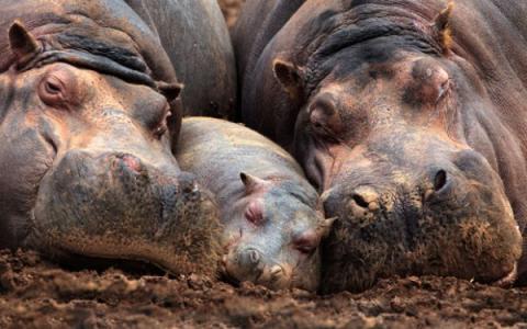 Gia đình hà mã với giấc ngủ trưa bình yên trên bãi bùn yêu thích.