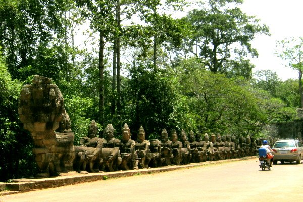 Nếu Angkor Wat làm bạn thán phục về những nét chạm khắc tinh xảo trên các vách tường và các bức tượng tượng trưng cho những công trình nghệ thuật tuyệt mỹ thì Angkor Thom, kinh đô cuối cùng của đế chế Angkor, sẽ làm bạn kinh ngạc về nét kiến trúc đền núi kỳ vĩ. Vào thế kỷ XV, kinh đô này bị người Xiêm phá hủy, vua Khmer phải dời đô về Phnom Penh. Ngày nay, dấu tích còn để lại ở nhiều nơi, cụ thể là các đền đài không còn nguyên vẹn và ở hai bên con đường dẫn vào đền là hai hàng tượng đá với nhiều pho tượng một bên là thần, một bên là ác quỉ, mỗi hàng nâng một con rắn thần (naga), thì đa số các tượng bên thần đều bị mất đầu.