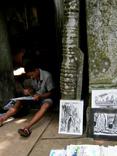 | Một thanh niên Campuchia ngồi cặm cụi vẽ tranh bán tại đền Ta Prohm. |