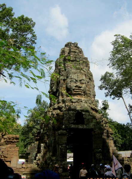 Ở đền Ta Prohm, chúng tôi được yêu cầu chuyển sang xe bus loại nhỏ mới vào được cổng đền Bayon. Đền Bayon nằm ở trung tâm quần thể Angkor Thom, được xây dựng vào thời vua Jayavarman VII, khoảng năm 1724 -1763. Đây là ngôi đền ấn tượng nhất về kiến trúc đền núi của Campuchia, bao gồm 54 tháp lớn nhỏ, mỗi tháp đều có điêu khắc khuôn mặt của đức Phật mỉm cười, với 4 hướng khác nhau. Tại đây, du khách rất hứng thú khi tạo ra nhiều kiểu hình chụp thật độc đáo (như mũi của bạn chạm vào mũi của đức Phật, tay bạn chạm vào đỉnh tháp…).