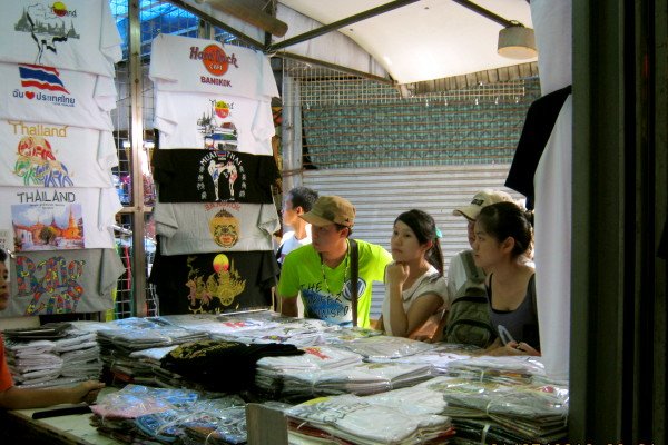 | Các khách hàng Việt Nam đang hỏi giá áo thun tại một gian hàng của chợ Chatuchak. |