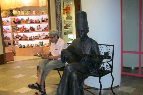 | Một du khách Thổ Nhĩ Kỳ đang ngồi bên bức tượng có người đàn ông chơi đàn ở điểm đến Istanbul. |