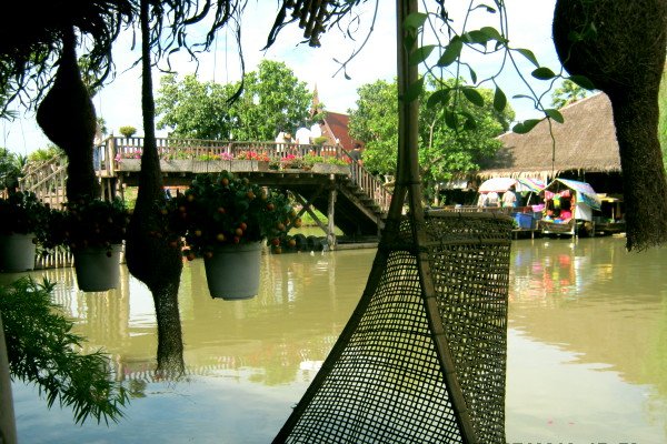 | Một góc chợ nổi Ayutthaya, xa xa có chiếc cầu gỗ bắc qua sông. |