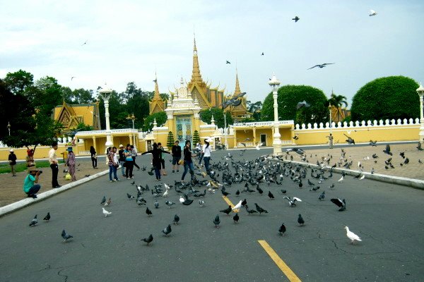 (TBKTSG Online) - Trên đường về, đi qua Phnom Penh, chúng tôi đến thăm cung điện hoàng gia Campuchia (The Royal Palace) lúc 7giờ 30, nhưng 8 giờ nơi đây mới mở cửa nên chúng tôi đã đi loanh quanh khu vực này và ngạc nhiên khi thấy rất nhiều chim bồ câu tại đây, chúng rất dạn dĩ. Khi chúng tôi rải thức ăn thì chúng liền sà xuống mổ lấy mổ để, tạo nên một khung cảnh rất nên thơ và yên bình. Mọi người trong đoàn đều tranh thủ chụp những tấm hình hiếm có này.
