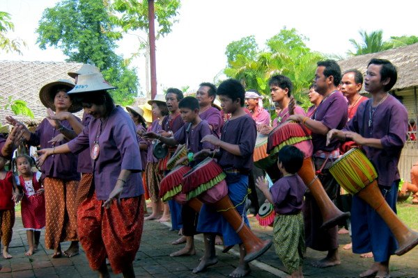 | Các diễn viên không chuyên hát múa theo nhịp trống. |