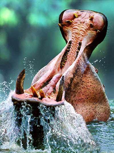 Với cái miệng há to để lộ những chiếc răng to tướng, con hà mã này thách thức tất cả đối thủ. Ảnh chụp tại khu bảo tồn thiên nhiên Elizabeth Queen ở Uganda.