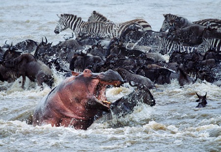 Hà mã tấn công linh dương và ngựa vằn trong lúc chúng vượt sông Mara thuộc khu bảo tồn thiên nhiên Masai Mara của Kenya. Mặc dù là động vật ăn cỏ, hà mã rất dễ tức giận và chúng không thích bị quấy rầy. Con hà mã này đang nghỉ ngơi thì bị đánh thức bởi hành động vượt sông của ngựa vằn và linh dương.