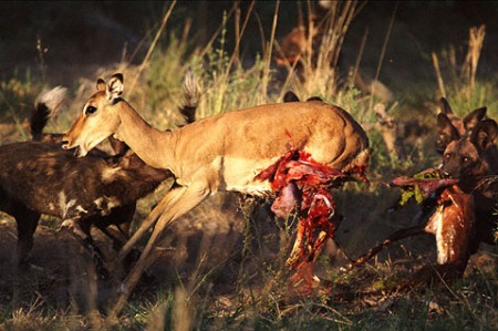 Đàn chó sói đuổi theo con linh dương châu Phi đang cố chạy dù chân sau của nó đã bị xé nát. Chó sói là những sát thủ đáng sợ, có thể giết chết và ăn thịt con mồi trong thời gian rất ngắn. Sói luôn duy trì tôn ti trật tự trong đàn. Chúng mang mồi về cho con non sau những chuyến đi săn, chăm sóc những con già, ốm hoặc bị thương.
