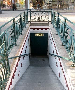 Cổng vào được đóng khung bằng những vòng xoắn kim loại, nó giống như cổng của tàu điện ngầm, nhưng khi đi xuống và bạn sẽ tìm thấy nhà vệ sinh ngầm với gạch hoa văn theo khuôn mẫu, và những bức tường đá cẩm thạch, và ốp gỗ gian hàng được trang bị với bồn cá nhân và đồng thau, đồ đạc vẫn còn ngăn nắp, sạch sẽ và mới toanh.