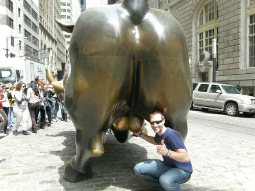 Đến thăm phố Wall, du khách không khỏi ấn tượng với một bức tượng tạc chú bò to lớn bằng đồng được dựng ở ven lề đường dẫn vào công viên Bowling Green. Đây được xem là một trong những biểu tượng của khu phố tài chính ở Manhattan. Bức tượng bằng đồng 7.000 bảng Anh nổi tiếng được tạo ra bởi Arturo Di Modica và đặt gần phố Wall với ý nghĩa có phần chơi chữ, thể hiện mong muốn đưa các nhà đầu tư trở lại sàn chứng khoán sau cuộc khủng hoảng năm 1987. Tuy nhiên, những thương nhân và du khách phải mạnh bạo chạm vào tinh hoàn của chú bò này nếu muốn gặp may mắn.