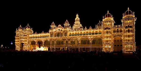 Cung điện Mysore, Mysore, Karnataka: Là một trong những cung điện xa hoa nhất trong vùng, Mysore kỷ niệm tròn 100 năm tuổi vào năm 2012. Vào các ngày chủ nhật và lễ hội, đèn hoa được thắp sáng, biến cung điện thành một lâu đài lộng lẫy.