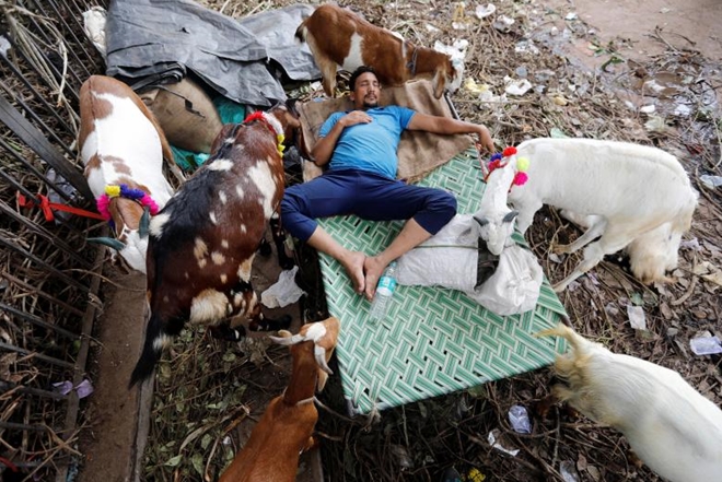 | Tiểu thương chợp mắt giữa bầy dê trong một khu chợ buôn bán gia súc tại khu phố cổ của Delhi, Ấn Độ. |