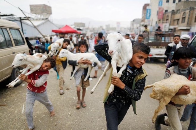 | Nhóm thanh niên vác trên mình những con vật hiến tế tạo nên khung cảnh nhộn nhịp ở khu chợ tại thủ đô Sanaa, Yemen, ngày 18/8. |