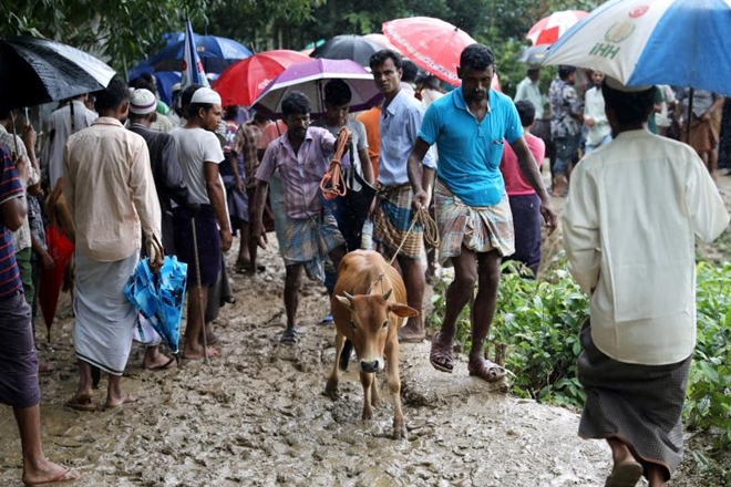 | Một người dân Rohingya đang dắt một con bê về nhà sau khi mua nó từ khu chợ trong trại tị nạn Kutupalong. |