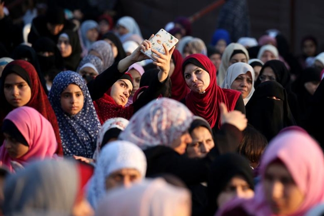 | Các cô gái Palestine tranh thủ “selfie” trước buổi cầu nguyện trong ngày đầu tiên của lễ Hiến sinh hôm 21-8. |
