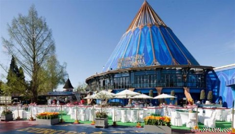 Nhà hàng Food Loop có hình dáng như một căn lều chóp nhọn bằng Plexiglas màu xanh dương bắt mắt trong công viên giải trí Europa Park - Ảnh: Hoàng Hải