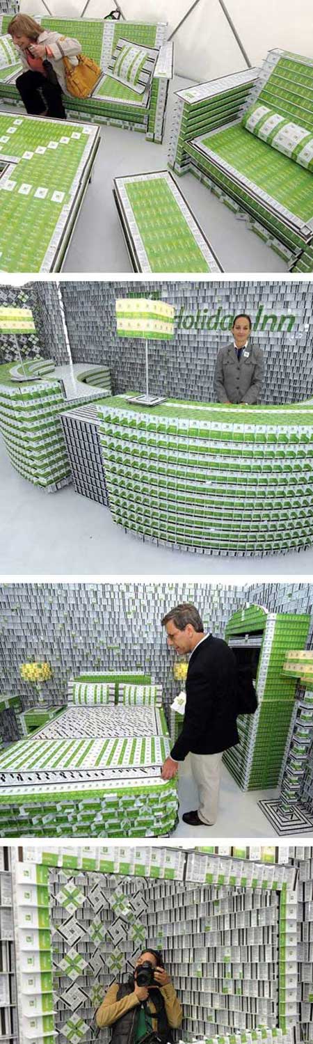Các chất liệu như ống cống, container, chocolate, muối... đều được tận dụng để tạo ra những khách sạn đầy đủ tiện nghi và độc đáo.