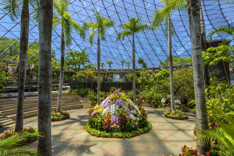 Vườn hoa Hanakairo có một mái vòm giống như cái chảo kính khổng lồ úp nghiêng xuống vườn.